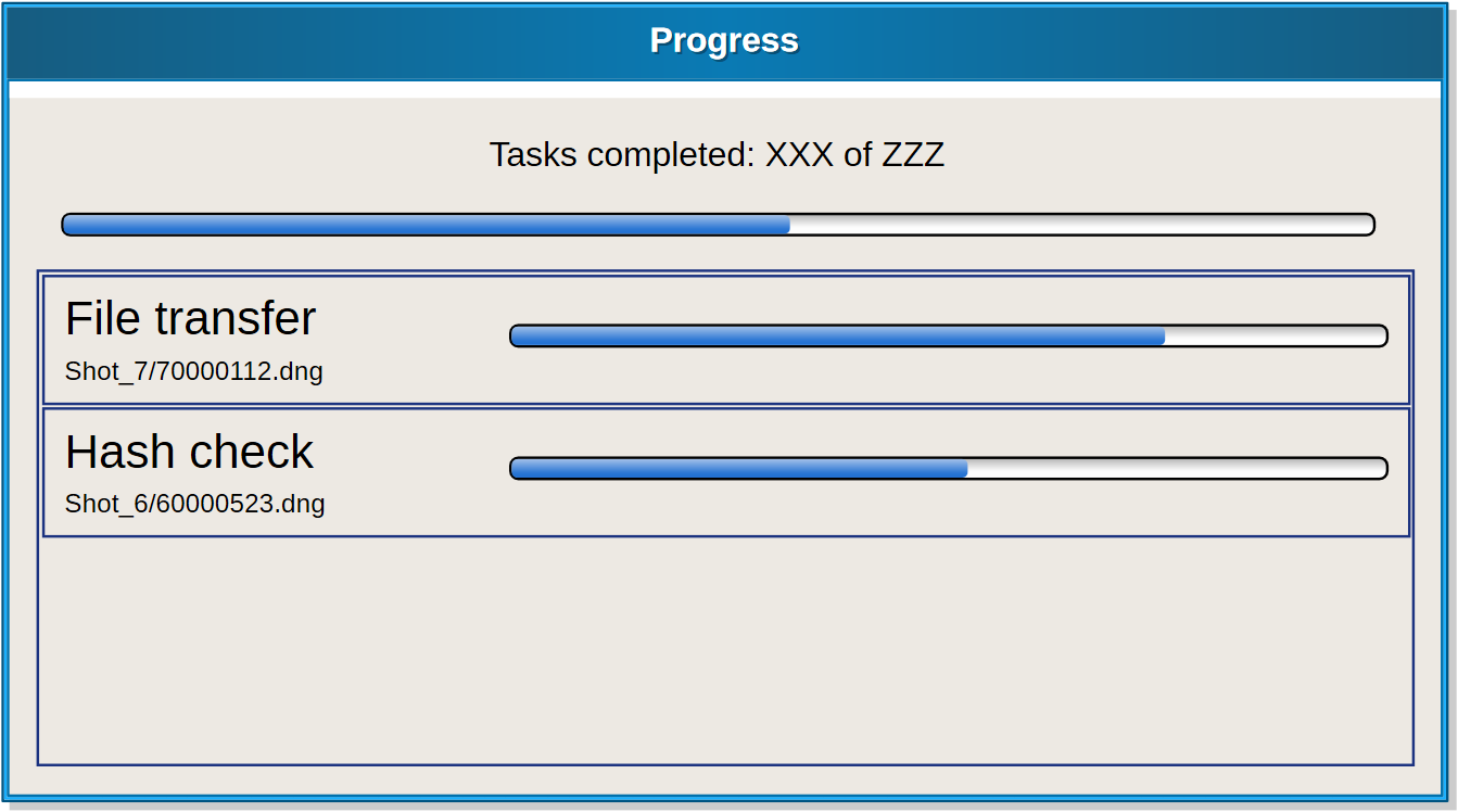 For example to show loading, copying or processing progress. Also sub-tasks should be supported and shown in the list at the bottom of the dialog.